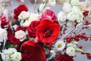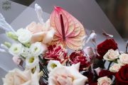 Romantischer, halbmondförmiger Winterstrauß in Rot- und Champagnerfarben - Blumenlieferung Budapest