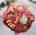 Big peach - red flower bouquet with cloud of small flowers - Flower Delivery Budapest