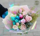 Különleges tulipánok rózsával modern csokorban (15 szál)